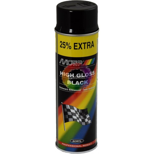 Motip эмаль аэрозольная, универсальная акриловая черная глянцевая, 500мл акриловая быстросохнущая эмаль для обработанных и необработанных поверхностей из дерева, металла, алюминия, стекла, камня и различных видов пластика.
